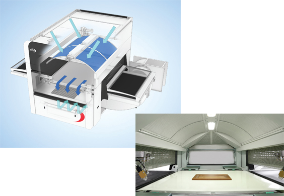 赛福徕CEFLA公司是采用CFB碳纤维材料传输带的公司,反向转动的滚轴用来清理并回收送料带上的漆料,而系统的其他部分可清洁喷涂房内皮带上的漆料。本机可将清洁用溶剂的消耗量和工作结束后的清洁时间减少。